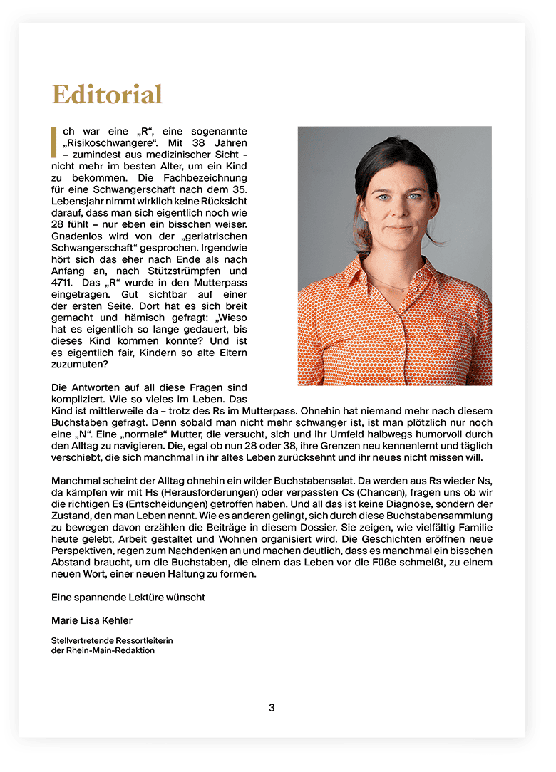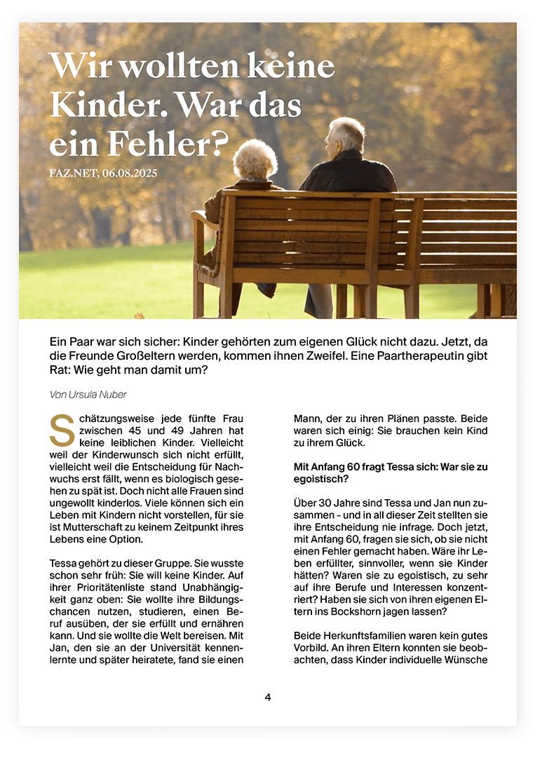Kinder oder Karriere, Stadt oder Land, Kleinfamilie oder Patchwork? Unser 27. Dossier erzählt von den großen Lebensentscheidungen der Gegenwart: von Paaren ohne Kinderwunsch, gefeierten Scheidungen, späten Eltern durch Leihmutterschaft, überforderten Müttern, Tradwives und Corporate Girls, digitalem Dorfleben, neuen Wohnformen und alten Stammtischen – klug beobachtet, analysiert und erzählt von unseren F.A.Z.-Autoren.